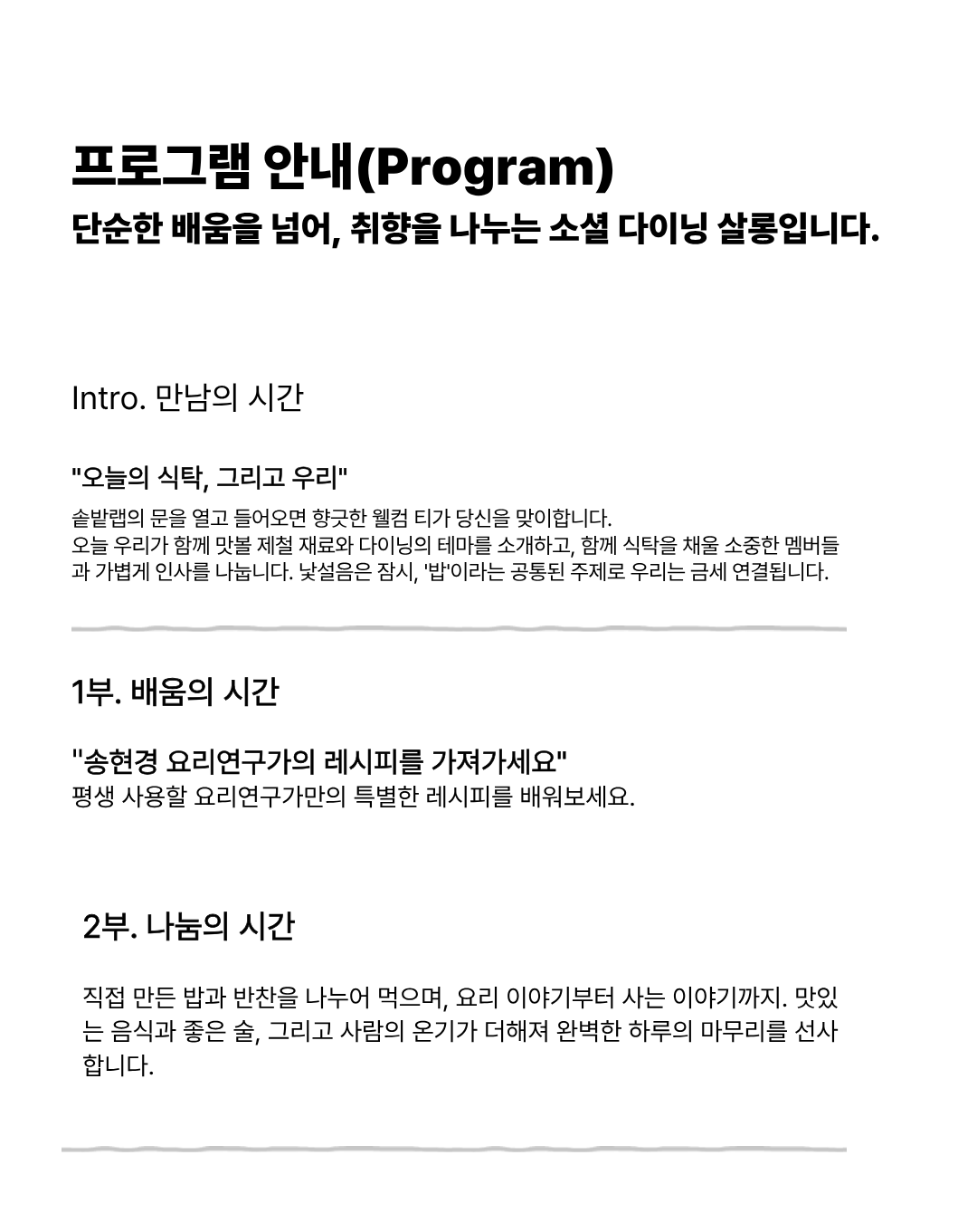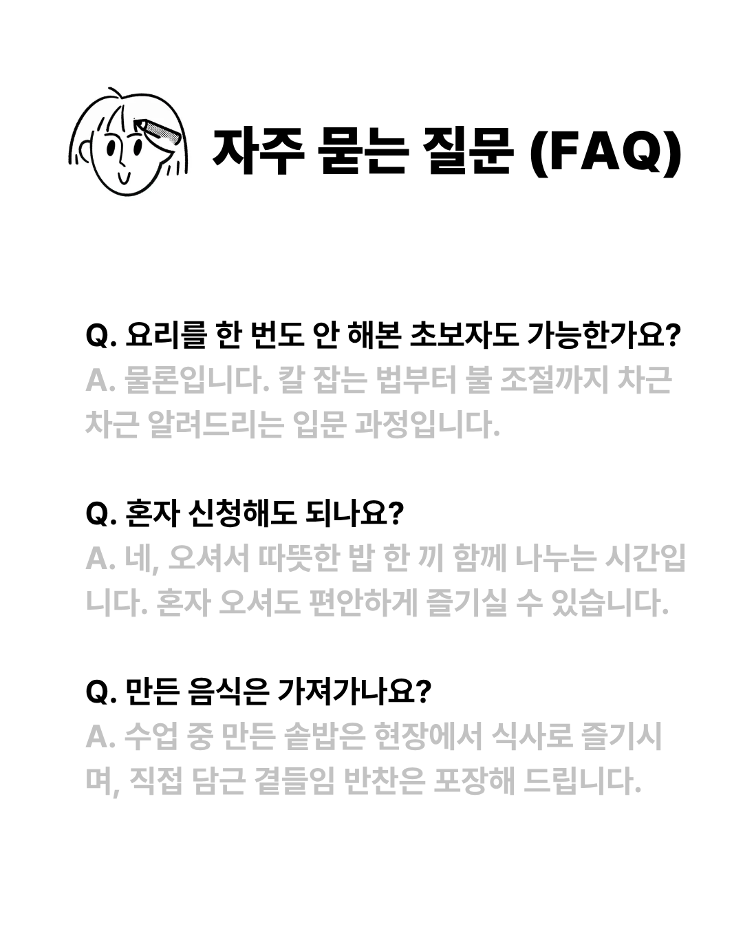 사전 연락 없이 불참하실 경우 환불이 불가하며, 정성껏 준비한 레시피 자료와 곁들임 반찬 등의 구성품도 수령이 어려울 수 있습니다.
