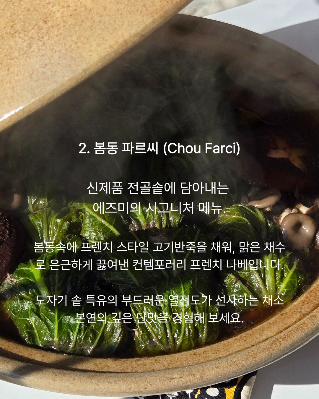 - 봄동에 고기반죽을 채워넣은 프랑스식 전골요리